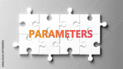 Parameters complex like a puzzle - pictured as word parameters on a puzzle pieces to show that parameters is complex and needs cooperating pieces that fit together. ,3d illustration