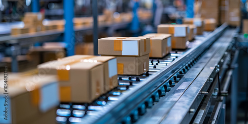 Parcel boxes on conveyor belt in distribution warehouse," "Packaging and logistics automation with boxes on conveyor