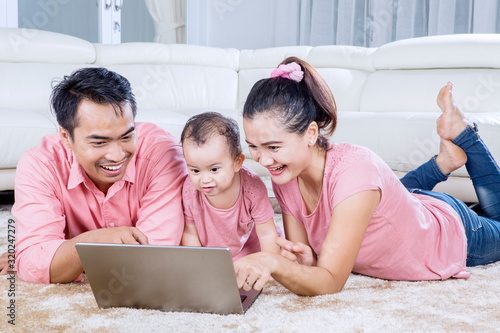 Parents and daughter using laptop on carpet