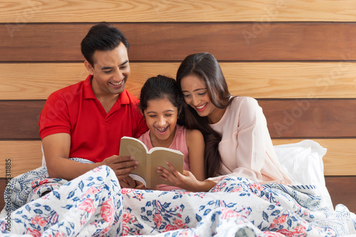 Parents reading a Book to their daughter on the Bed At Home