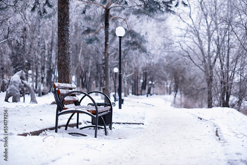 park bench on a winter alley at snowfall. bench with snow after snowstorm or in snow calamity in europe