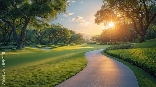 Park setting with green grass fields beside a golf course bunkers sand, sunlight and flare background. pathway winding through beautiful trees for running and cycling