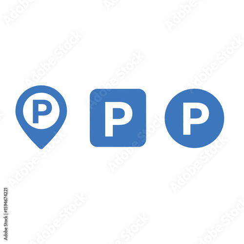 Parking Location Icons Map Pin, Square and Circle in Blue. Parking Space Signage, Navigation and Accessibility. Simple design for parking guidance.