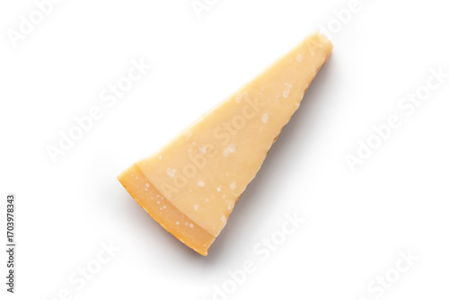 Parmesan cheese wedge, overhead flat lay shot, isolated on a white background
