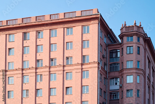 Part of classic real estate building or block of flats of pink color standing against blue sky in the center of modern city