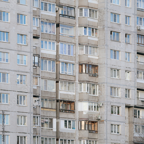 Partial facade of a panel multi-story apartment building, an example of Soviet panel architecture in Saint Petersburg, Russia.