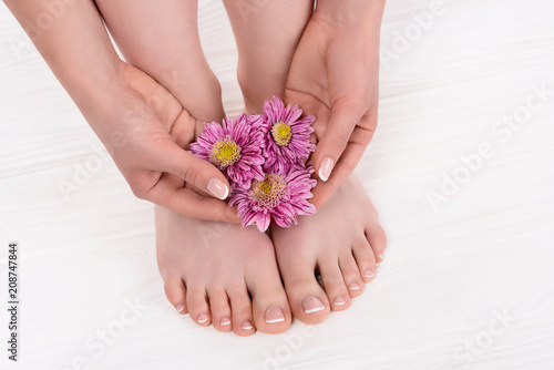 partial view of barefoot woman with flowers on pedicure procedure in beauty salon