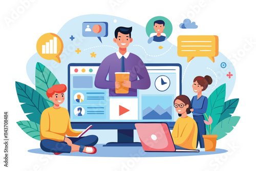 Participants are involved in an interactive online webinar, exchanging ideas and learning together Webinar with flat illustration.