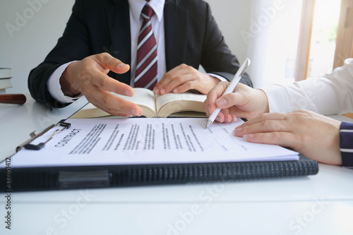 Partner lawyers or attorneys discussing a contract agreement. Successful businessmen hand putting signing contract,have a contract in place to protect it,signing of modest agreements form in office.