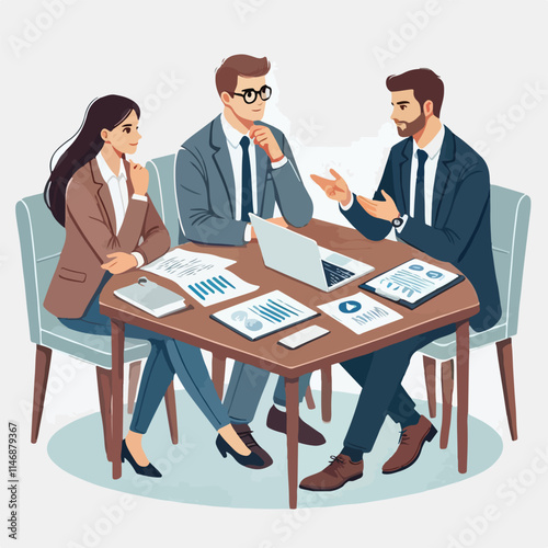 Partners meeting for business discussion with documents and laptop on desk. Couple at round table, speaking, discussing work, partnership. Flat vector illustration isolated on white background