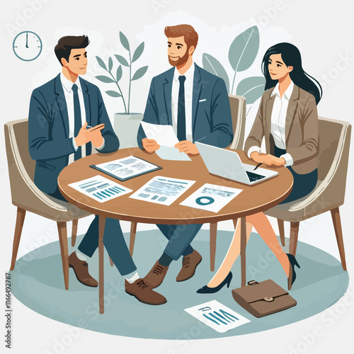 Partners meeting for business discussion with documents and laptop on desk. Couple at round table, speaking, discussing work, partnership. Flat vector illustration isolated on white background