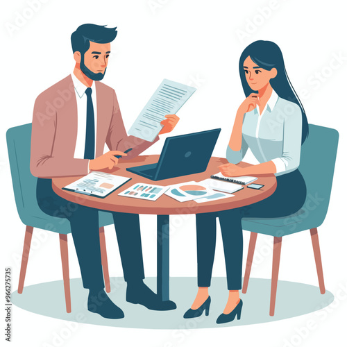 Partners meeting for business discussion with documents and laptop on desk. Couple at round table, speaking, discussing work, partnership. Flat vector illustration isolated on white background