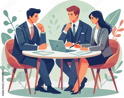 Partners meeting for business discussion with documents and laptop on desk. Couple at round table, speaking, discussing work, partnership. Flat vector on a white background