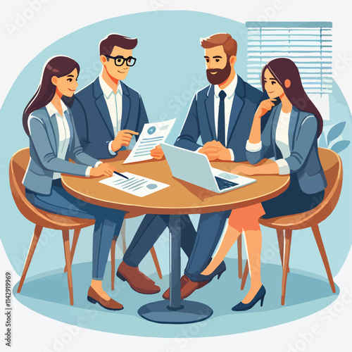Partners meeting for business discussion with documents and laptop on desk. Couple at round table, speaking, discussing work, partnership. Flat vector on a white background