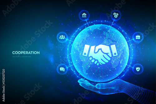 Partnership technology concept. Business partnership. Global cooperation network. Internet communication. Teamwork. World map point, line composition. Earth planet globe in hand. Vector illustration.