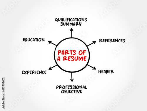 Parts of a Resume (brief summary of personal and professional experiences, skills, and education history) mind map text concept background