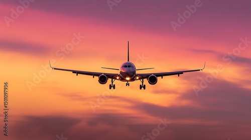 Passenger airplane against sunset sky, journey into vibrant horizons