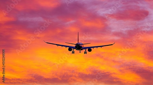 Passenger airplane against sunset sky, journey into vibrant horizons