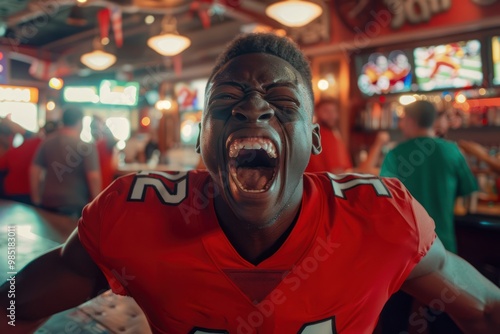 Passionate black man cheers wearing red jersey in vibrant sports bar setting. High-energy atmosphere with friends enjoying drinks and conversations. Warm indoor lighting emphasizes excitement and joy.