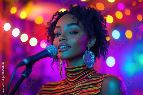 Passionate vocalist delivering vibrant soul music in a colorful live performance setting