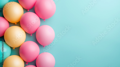 Pastel balloons in pink, yellow, and blue clustered together on the left side of a blue background, creating a festive and cheerful scene.