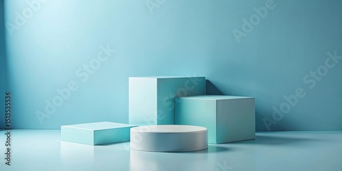 Pastel Blue Minimalist Product Display with Geometric Shapes and Subtle Lighting