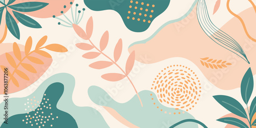 Pastel colored abstract background featuring organic shapes, leaves, dots, and flowing lines creating a modern and artistic backdrop