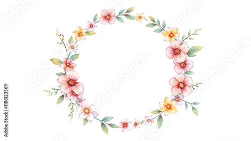 Pastel drawing artistic image of floral wreath as a frame for round white space. some leaves or flowers may overlap that white background. it has to be colorful, look natural. Generative AI