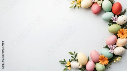 Pastel Easter background with a watercolor wreath of eggs and flowers, leaving the middle section blank for text