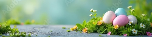Pastel eggs nestled in spring greenery on grey concrete, elegant, chick, rustic