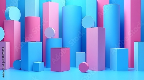 Pastel Geometric Composition: A vibrant and playful arrangement of pink and blue geometric shapes, including cylinders, cubes, and circles, creates a visually engaging abstract scene.