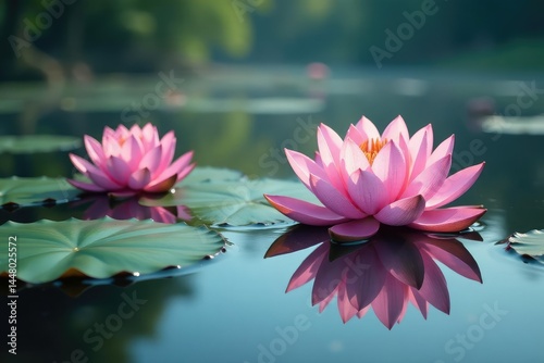 Pastel lotus flowers create a repeating design on still lake water , pattern, floral