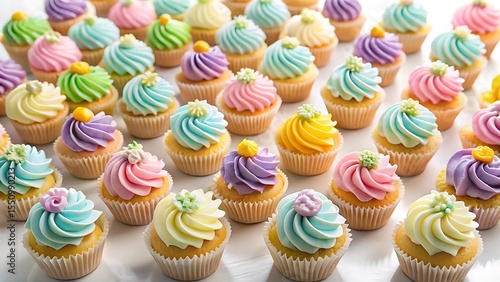 Pastel Mini Cupcakes Arranged in Rows on White Background
