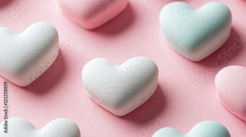 Pastel pink background with multiple heart shaped sweets in shades of white, pink, and light blue. Close up shot showing textured surface of the