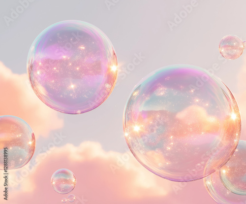 Pastel pink bubbles background of whimsical and dreamy depiction of floating soap bubbles against a pastel colored sky