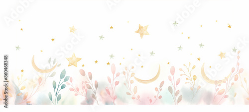 Pastel Stars Moons Border horizontally Seamless White Watercolor background: baby shower, Greeting card