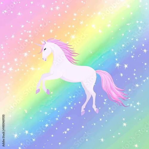 Pastel unicorn on a rainbow, starry background. A whimsical image of a white unicorn with pink mane and tail, against a multicolored rainbow backdrop, sprinkled with glittering stars