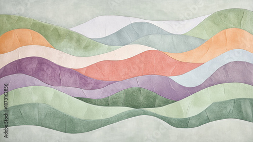 Pastel waves in muted tones of green, peach, and purple, creating a serene, flowing landscape with subtle depth and texture.