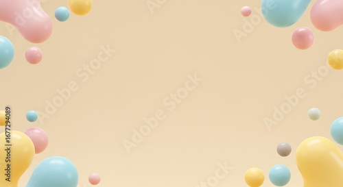 Pastel-colored 3D abstract shapes frame a light beige background.