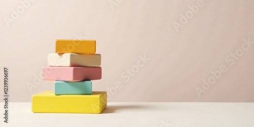 Pastel-colored blocks stacked in a precarious yet balanced arrangement against a soft neutral backdrop, symbolizing concepts of stability, growth, and achieving equilibrium
