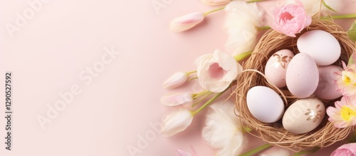 Pastel-colored Easter eggs nestled in a straw nest surrounded by soft pink flowers and fluffy white decorations on a light pink background