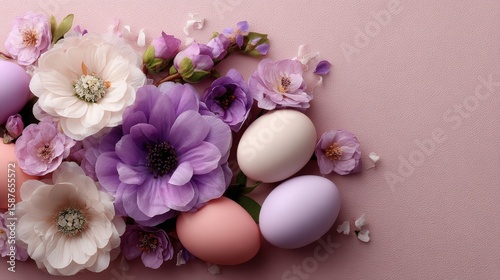 Pastel-colored eggs and delicate flowers arranged on a soft pink background, creating a serene and elegant springtime composition.
