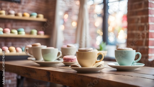 Pastel-colored macarons atop coffee cups a rustic wooden table a charming cafe.