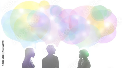 Pastel-colored thought bubbles above silhouettes, representing creative feedback concepts on white background.