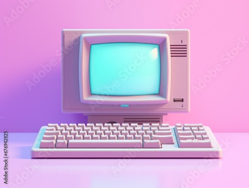 Pastel-colored vintage computer setup, featuring a classic keyboard against a monochrome background