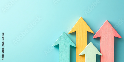 Pastel-colored wooden arrows pointing upward on a light-blue background, symbolizing growth, progress, and positive movement. Free space available for text