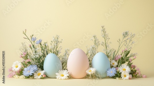 Pastel-themed Easter composition with decorative eggs and flowers in a spring setting