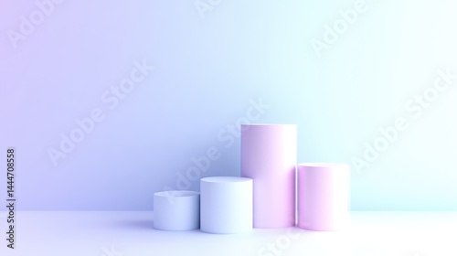 Pastel-toned display podiums. Three cylindrical podiums in light pastel shades of pink and blue, arranged in a stacked formation against a soft gradient backdrop