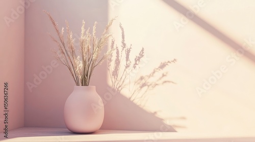 Pastel-toned still life with dried grasses in a vase, soft light and shadows