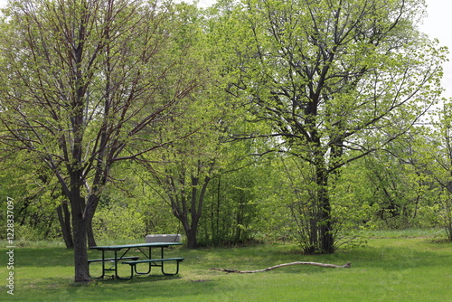 pastoral spring landscape with picnic table under fresh green shady leafing trees and fallen limb on thick grass